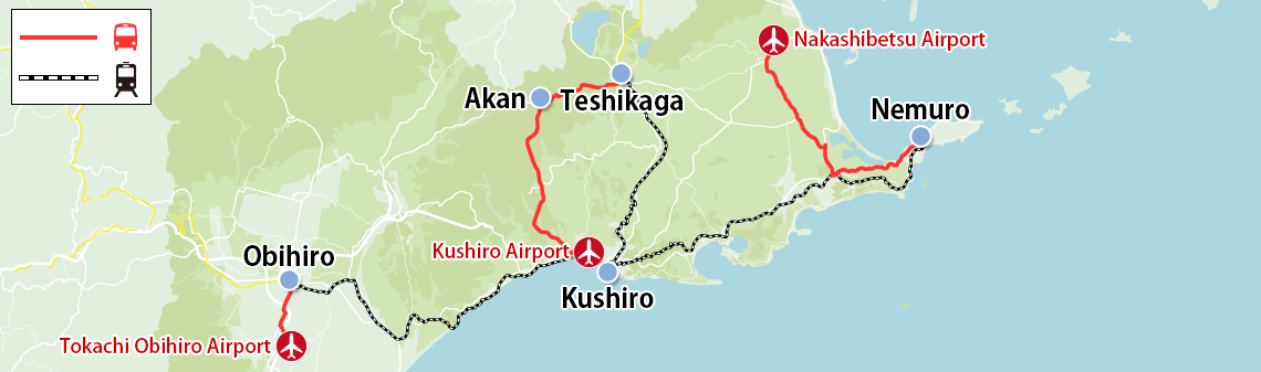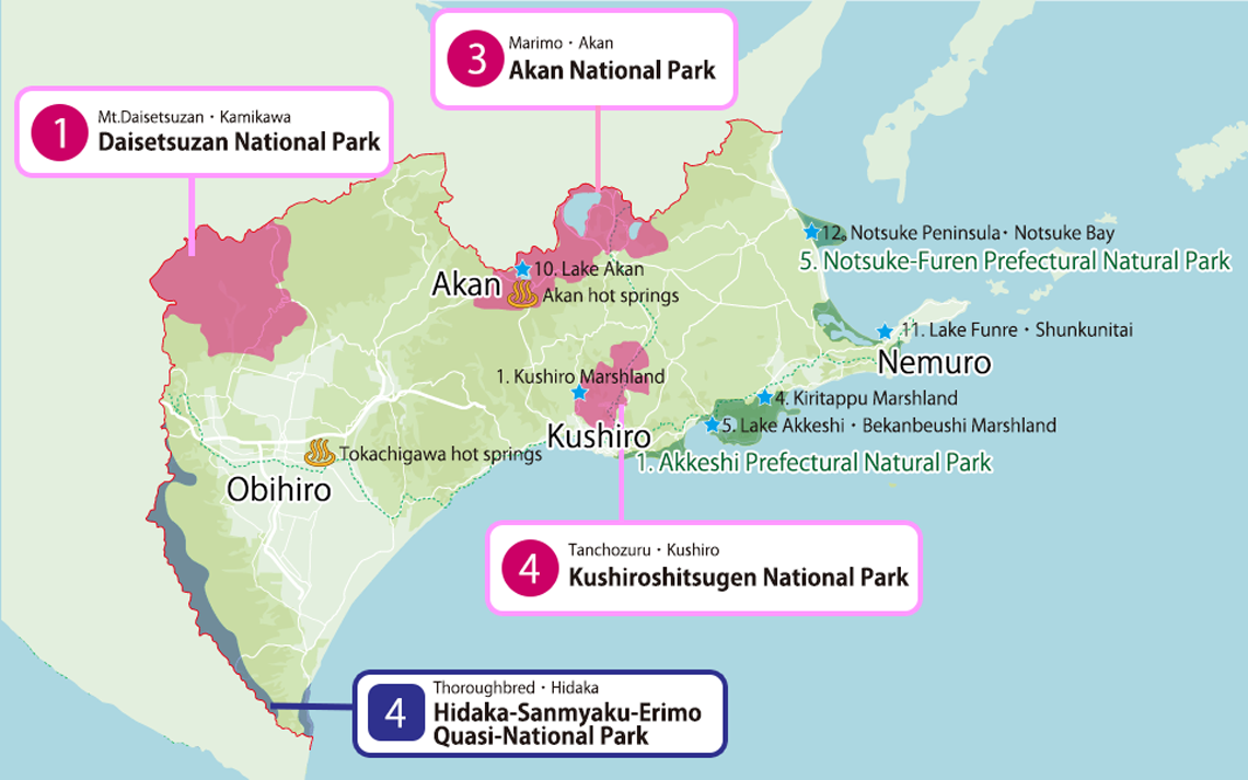 Daisetsuzan National ParkTaushubetsu River Bridge, Lake Nukabira, Lake Shikaribetsu, Mt. NipesotsuAkan National ParkLake Akan, Lake Kussharo, Lake Mashu, Onneto, Ainu Kotan, Kawayu OnsenKushiroshitsugen National ParkKushiro Marsh Observatory, Onnenai Wooden Path, Hosooka Observatory, Lake Touro |