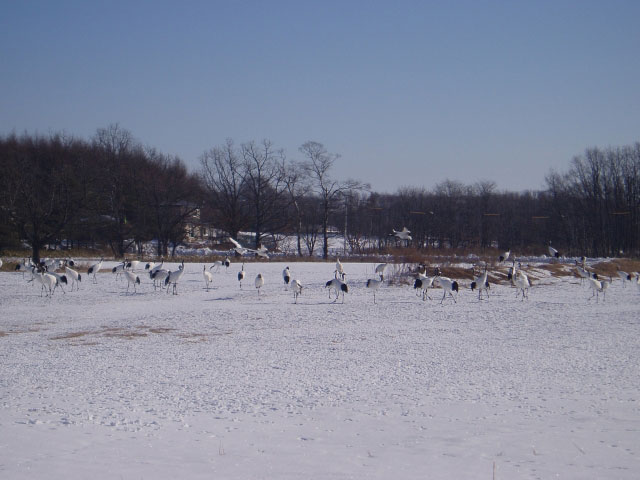 Red-crowned cranes can be seen at Tsurumidai from November to March. At peak times, nearly 200 birds gather, performing their graceful dance.