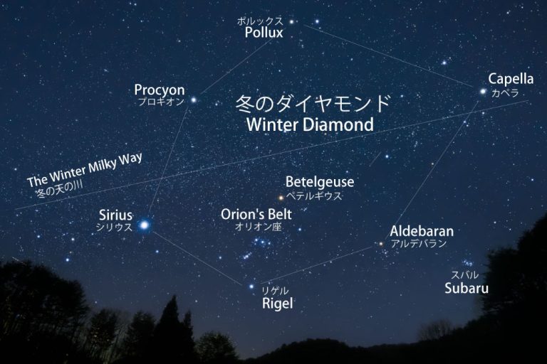 In February in Minamifurano, you can also see the Winter Diamond (the six brightest stars). The red object in the center of the photo is Betelgeuse, meaning both the Winter Triangle and the Winter Diamond can be seen together.