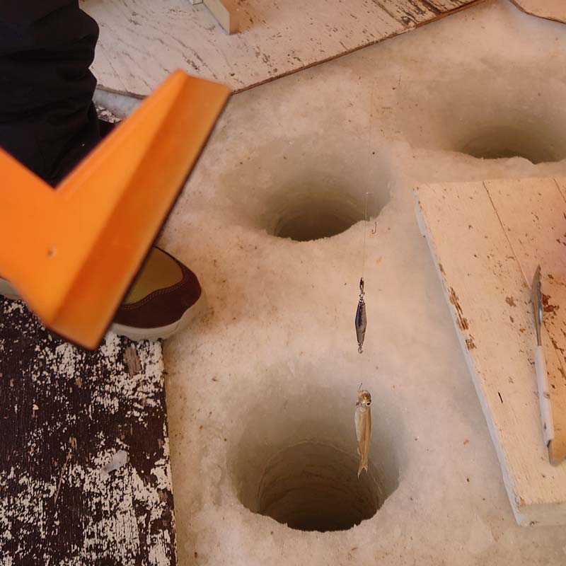 Inside the ice fishing tent, you’ll drill a hole in the ice. Drop your fishing line through the hole into the water below. When you feel a little tug, a “picking” sensation, it means the smelt is nibbling on the bait. Then, just as the fish takes the bait, pull the rod with a firm motion! And voilà, you’ve caught it!