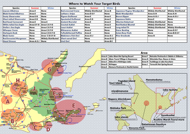The list of species includes a number of iconic birds such as Red-crowned Crane,Blakiston’s Fish Owl and Steller’s Sea Eagle, but the list of interesting species goes on and on: White-tailed Eagle, Whooper Swan, Harlequin Duck, Black Scoter, White-winged Scoter, Japanese Cormorant, Pelagic Cormorant, Red-faced Cormorant, Hazel Grouse, Latham’s Snipe, Brown Dipper, Spectacled Guillemot, Pigeon Guillemot, Ancient Murrelet, Rhinoceros Auklet,Tufted Puffin, Ural Owl, Shorteared Owl, Black Woodpecker, Japanese Pygmy Woodpecker, Grey-headed Woodpecker,White-backed Woodpecker, Japanese Robin, Siberian Rubythroat,Gray’s Warbler, Middendorff ‘s Grasshopper Warbler, Lanceolated Warbler, Asian Rosy Finch and so on.