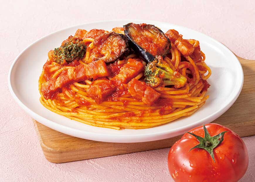 This classic tomato pasta dish is satisfying with the flavor of eggplant cut into large pieces and aged bacon.