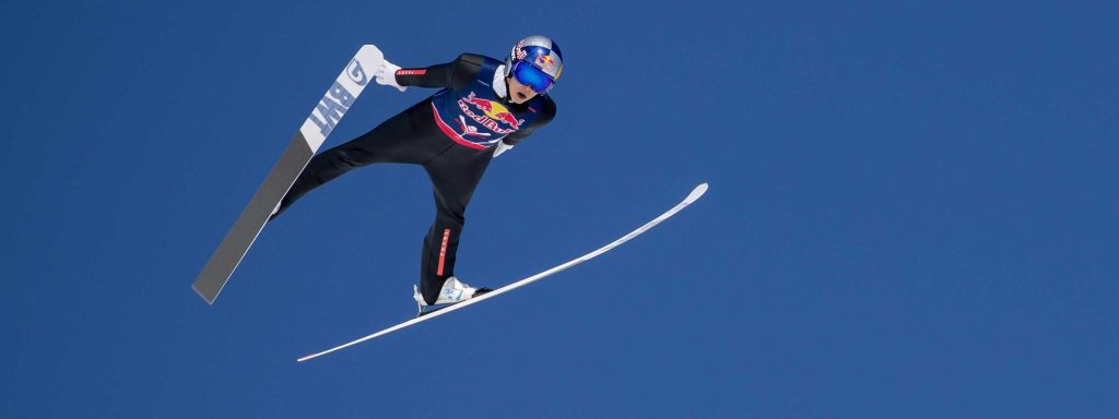 In this competition, skaters glide from the top of thein-run toward the take-off table, and compete for the beauty of their aerial posture and landing after launching into the air = flying style points and distance points. In a nutshell, the score is based on how beautifully the skier flies.