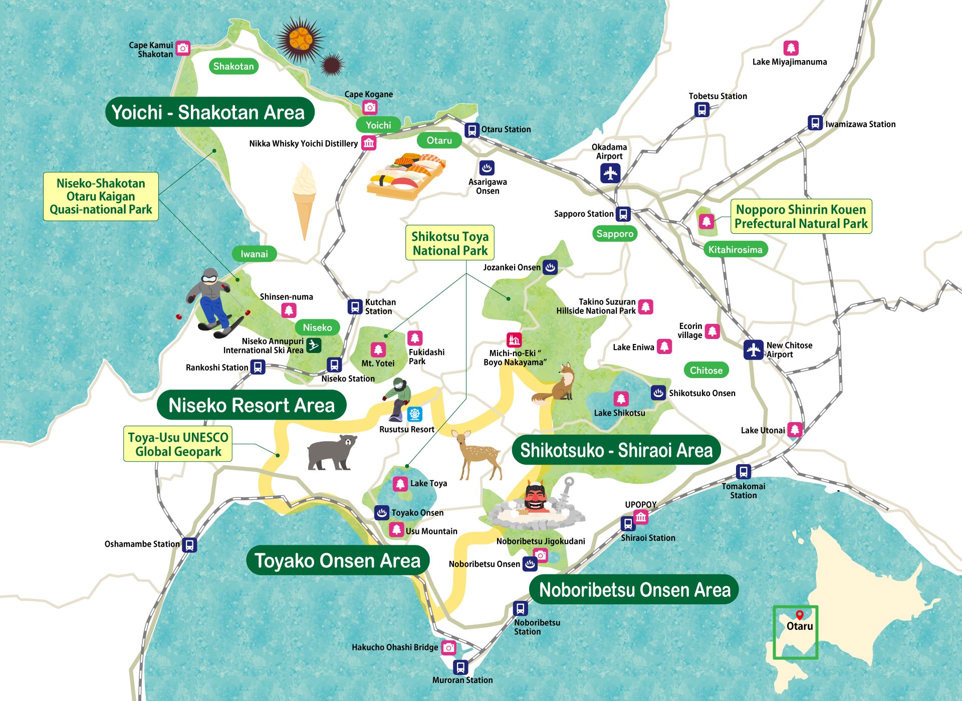 There is a railroad that circles around the Central Hokkaido area. From Sapporo Station, Otaru – Yoichi – Niseko – Oshamanbe (Hakodate Main Line). On the other side is Shin-Sapporo – Kitahiroshima – Chitose (airport) – Tomakomai – Shiraoi – Noboribetsu – Muroran – Lake Toya – Oshamanbe (Chitose and Muroran Main Lines). There are two National Parks in this area. There is one Geopark. It is a complex area of nature, history, Ainu culture, and modern urban development.