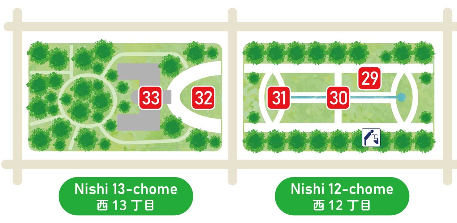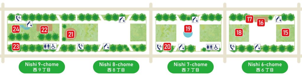 The course is about 1.6 km long from Odori Nishi 1-chome to Odori Nishi 13-chome, a distance of about 30 minutes, and takes about 2 hours at a leisurely pace, visiting monuments and resting at fountains and benches.