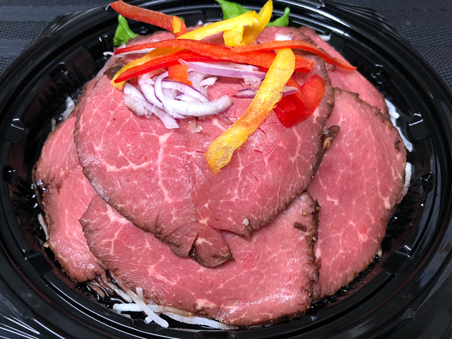 The roast beef is carefully sliced in-store. Please enjoy the savoury flavor that spreads over the palate. Served with bell peppers and onions.